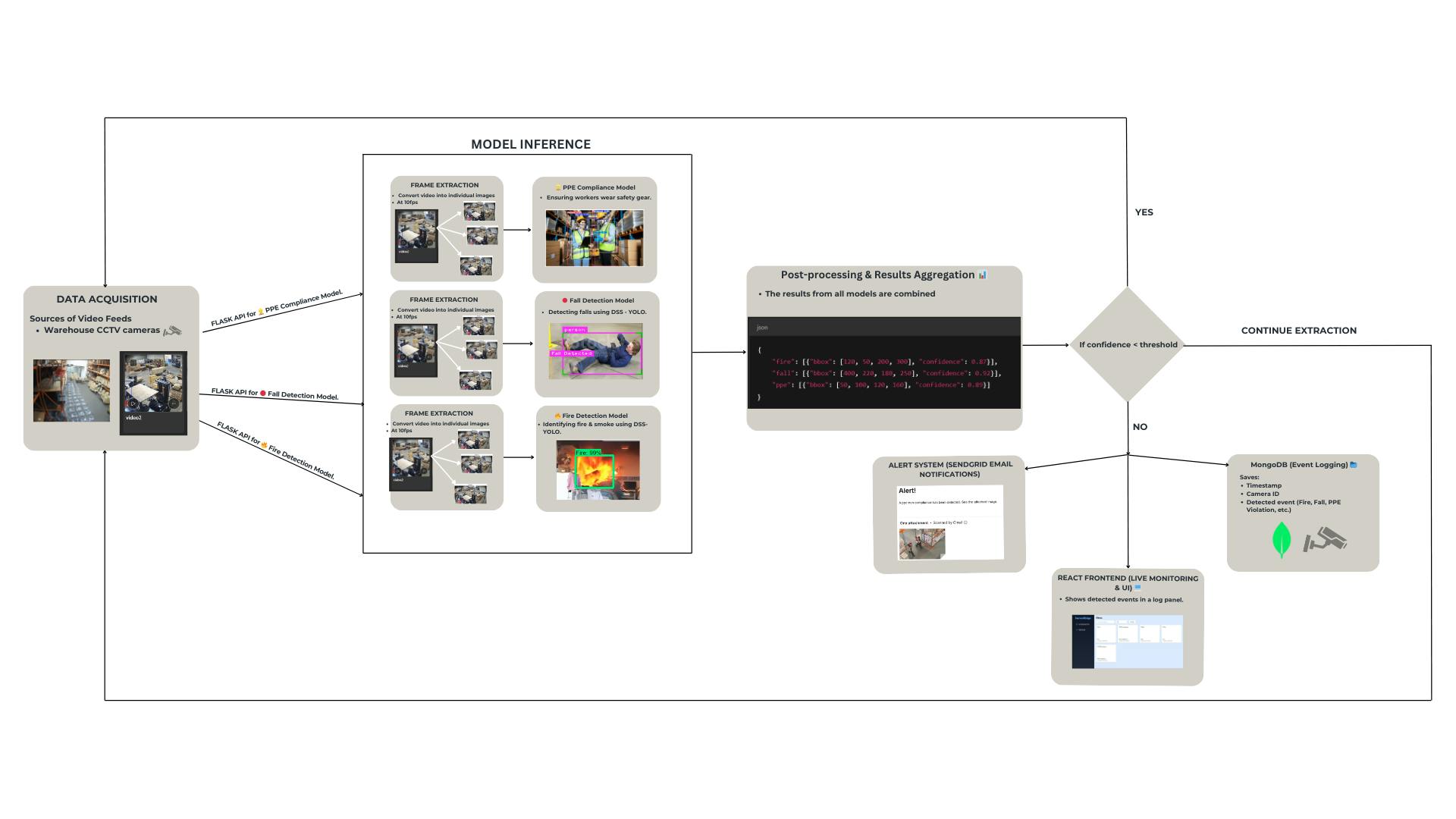 - Backend: Flask API for video processing, model inference, and alert generation.